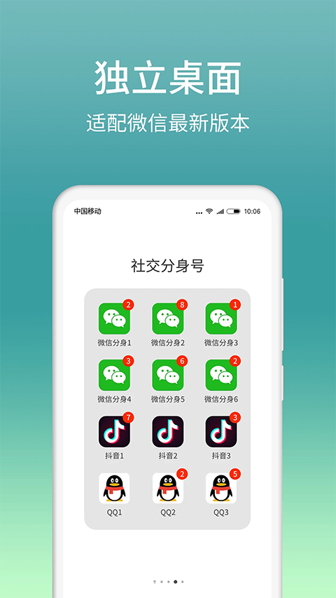 - 微信分身:点击“添加”按钮→跳转到应用列表页→点击想要分身的APP如“微信”,登陆你的第2个、第3个、第N个微信账号,就能实现你的多个微信在一部手机上同时在线聊天了。 - 桌面图标:长按分身APP图标,点击“放到桌面”→开启【创建桌面快捷方式】权限→在手机桌面就能快速进入多开应用,方便快捷。 - 消息提醒:如微信消息提醒,如果无法收到分身微信发来的消息,请在手机设置里打开“微信分身”的通知栏允许权限,同时将“微信分身”加到手机设置及安全软件的白名单里面。更新日志