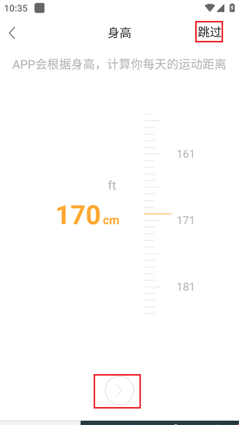 1、点击打开智慧手环3,根据实际情况选择自己的身高,然后点击下方红框处,也可以直接右上角跳过。