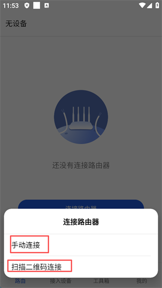 2、选择连接方式,扫描二维码连接需要扫描路由器上的二维码,而点击“手动连接”。