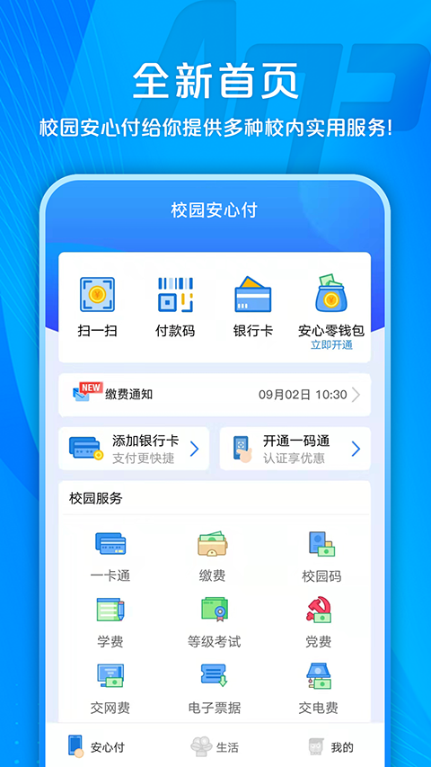 校园安心付是针对校园在线缴纳各种费用而设计推出的一款跨行支付服务平台,现在很多大学都要求无现支付,全部要求 使用校园一卡通卡刷,而校园一卡通都会有额度限制,这主要是为了培养学生是的良好消费习惯,提高学生的自我约束意识和节约意识,督促学生理性消费,但每当一卡通里的钱用完了那就得去充值机前排队充值,一个三四万以上人数的学校可想而知要排多长的队,为了方便学生和教职工充值校园卡、缴各种费用等,成都智汇安新科技有限公司开发了校园安心付,校园安心付针对广大师生群体一卡通、缴纳学费、考试费、网费的实际充值支付需求,提供全面支持国内200多家银行的快捷支付服务。在这里不仅可以在线在线充值一卡通、缴纳上网、水电、学杂、考试、培训等各类费用,从此告别排队烦恼,而且学校后台还可无限制自定义缴费项,结合教务财务系统轻松管理,从此免去学校异地跨行取现的高昂取款成本,足不出户无需排队即可轻松完成充值、缴费。