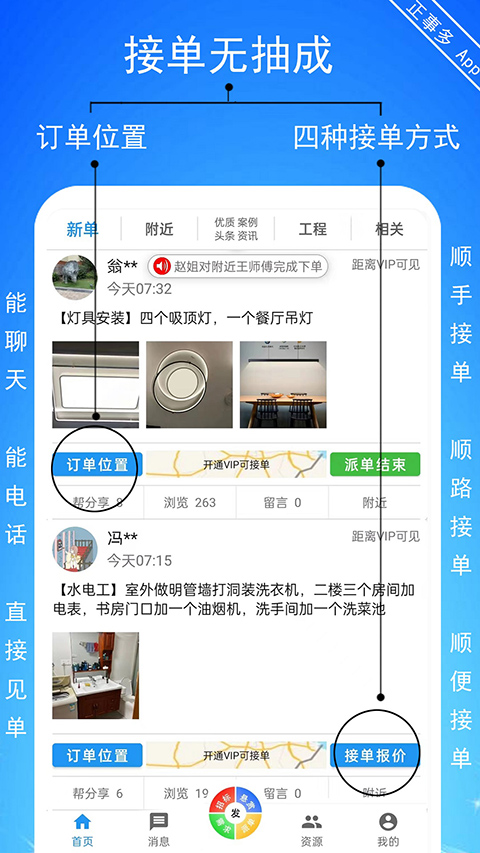 1、接单派单接活 智能商务的功能,多种订单合同模式,不限行业、职业、工种,线上线下订单交易管理,派人接活 接单派活、电子单据收据,无纸化商务办公,原笔迹签字验收。 2、名片推广营销 为主页名片设置红包,让人主动转发分享你的名片或企业,坐标宝藏解秘。 3、发布店面坐标 发布好吃好玩的坐标,店面坐标,旅游坐标分享、共享打印机、共享办公室、共享汽车、共享自行车、共享经济。 4、聊天通讯定位 通讯定位:定位家人员工、上下班GPS定位打卡签单,列表定位显示、聊天。 5、打卡考勤管理 定位员工坐标定时定位签到考勤管理,团队旅行定位。 6、本地异地服务 装修施工技工师傅、家政保洁、上门洗车、家电维修、开锁,搬家公司,美容美甲、找各类师傅、技师、安装师傅、维修师傅、防水维修、家居维修、房屋维修、油漆木工师傅等。 7、售后安装维修 售后服务外包,家具安装、家具维修、木门安装、地板安装、网购家居线下售后外包安装与维修,家电维修、电脑维修、安防弱电。 8、装修建筑派单 家具、木门、地板、灯饰建材销售,装修设计施工,泥工、木工、油漆工、水电工、卫浴安装、窗帘安装、马桶安装、修防水、各种专业安装工、维修工、养护、家居环保装修翻新施工。服务内容