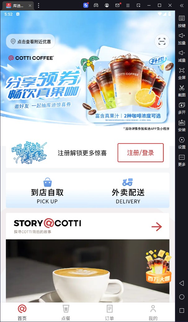 库迪咖啡电脑版是需要借助模拟器在电脑上运行的一款在线咖啡点餐软件。软件为用户提供在线订购、咖啡俱乐部会员服务等功能,致力于让用户轻松享受咖啡生活,更有着不断更新的饮品系列,包括浓郁美味的意式浓缩咖啡、清新怡人的冰美式等,满足用户的多样化口味需求,享受高品质的咖啡生活。
