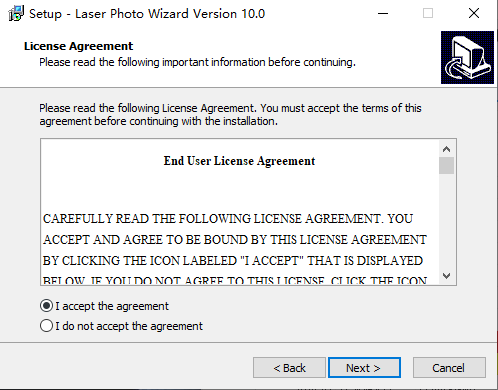 1、从本站下载解压后,即可得到Laser Photo Wizard Pro安装程序2、双击“SetupLaserPhotoWizard10.exe”文件运行,勾选协议开始安装
