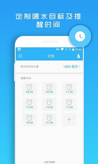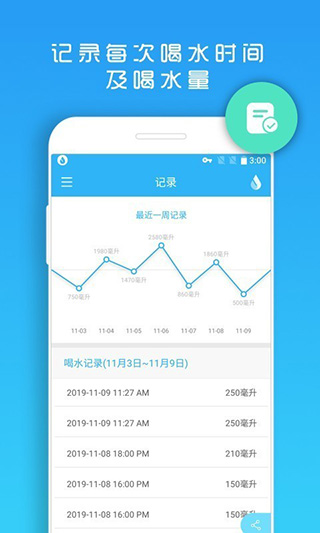 1、设置目标饮水量; 2、设置喝水时间; 3、记录每天平均喝水量; 4、喝水专属提示音;软件特点