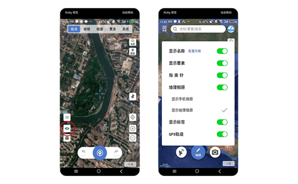 在软件界面中点击左下角的“眼睛”图标,可以对叠加图层进行显示隐藏控制,如矢量标注、指南针、地理相册、手机相册、地名标签或GPS轨迹显示控制等。