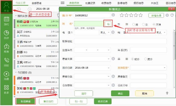 一、如何新增患者? 1.在患者栏目中点击新增患者,进行患者信息简易登记