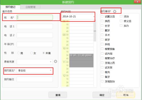 1、在时间刻度上面,双击鼠标左键,弹出【预约界面】 2、在预约界面中,带星号(*)的字段是必须要填写的,比如【姓名】、就诊医生、【就诊时间】,还有【预约事项】