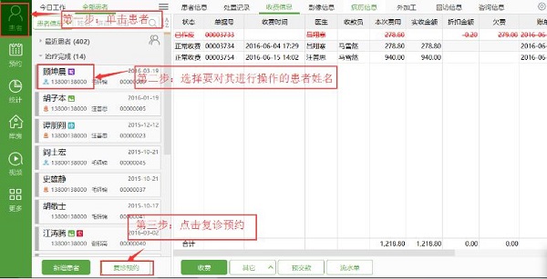 1.进入复诊预约界面。在【患者】菜单中,选择复诊患者姓名点击【复诊预约】,进入复诊预约界面