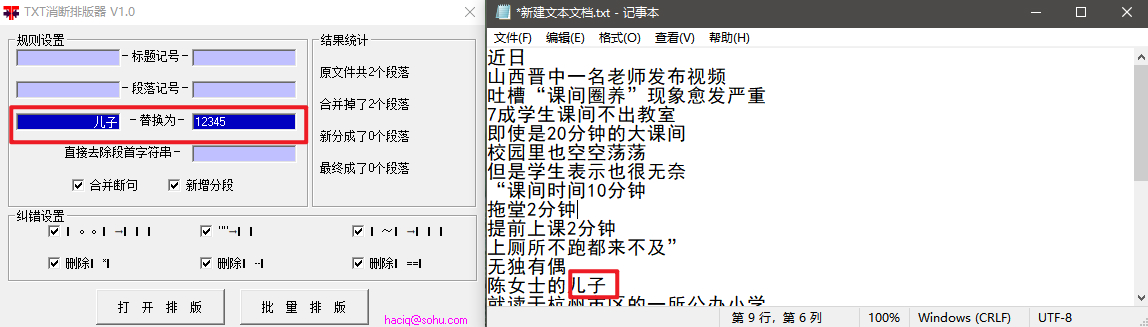 2、文本替换。支持多行文本替换,支持并行符“|”隔开多组替换内容对应替换,支持正则表达式替换。