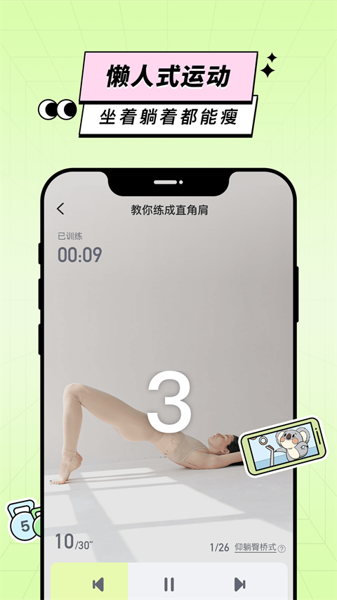 1、私人专属定制懒人瘦身计划 搜集简单信息,了解你的生活习惯与身材状况,100%为你制定适合自己的专属瘦身计划,只需完成每日分配热量任务,五分钟轻量化运动训练,不限场地器材,每天在家也能轻松瘦身,简单易坚持。 2、健康食谱定制 海量食物信息数据库,帮你选择合适的食物,量身定做饮食计划,营养、丰富,委屈谁也不能委屈自己的胃,不饿肚子也能华丽蜕变。 3、劳逸结合,科学瘦身 不用天天运动,在为你制定的休息日与运动日里合理饮食加适当运动消耗身体热量,用热量缺口达到健康瘦身目的。 4、记录日常,健康作息,直面变化 记录计划开始的每一天,记录体重、体脂、围度等多维度数据变化,直观看见身材变化让坚持瘦身不再困难,陪伴你瘦身的第一步到每一步。 5、专业教学视频,动作讲解分析 大师级健身教练录制视频把握课程内容,重点部位针对训练,运动后针对性拉伸,标准的动作演示和精准的语言描述帮助你高效燃脂。更新日志