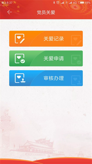 (七)党员关爱用于“党员关爱”工作的记录、申请和办理等。党组织可在此模块记录“党员关爱”活动开展情况,也可以在线发起“党员关爱”的申请,上级党组织收到申请后在线审批、办理。