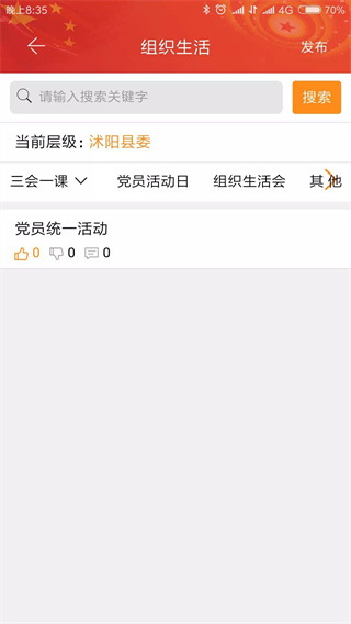党组织系统管理员可点击右上角“发布”按钮,通过手机将组织生活开展情况拍照上传。