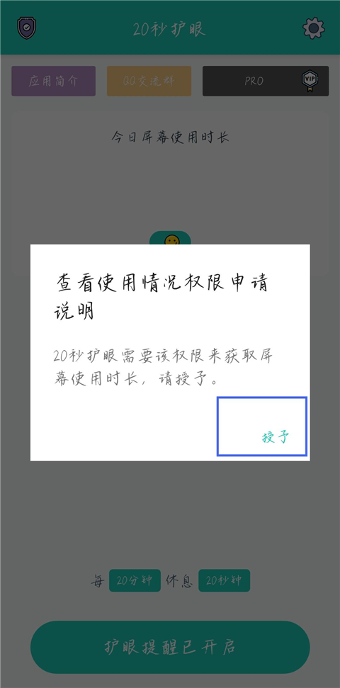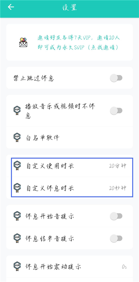 1、自定义提醒周期 您可以设置连续使用多久眼睛以后开始提醒护眼,完全自定义,根据每个人不同的情况,使用不同的护眼方案。 2、强制休息 您可以设置强制休息,以防自己由于忍受不住诱惑关闭护眼或不按时间休息。 3、详细的统计 可查看您软件的使用时间、开启次数,与以往对比、以及与其它用户对比,看看自己是否在某个app上面消耗时间过度,用眼过度,帮助您更好的规划手机的使用。20秒护眼App如何设置使用时长和休息时长