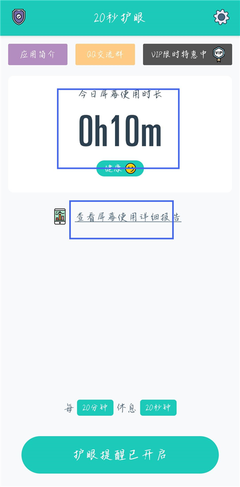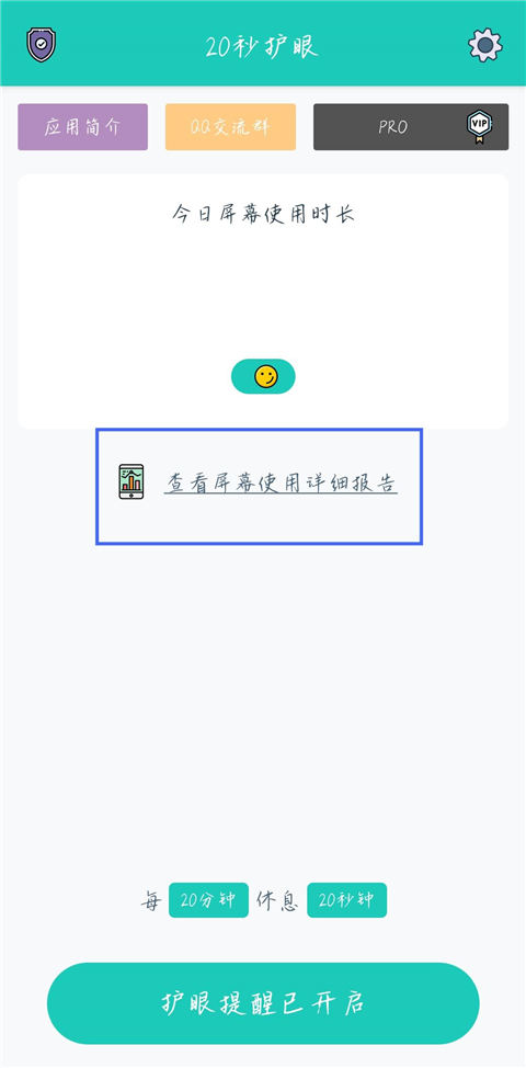 1、进入20秒护眼App主页面,点击【查看屏幕使用详细报告】。