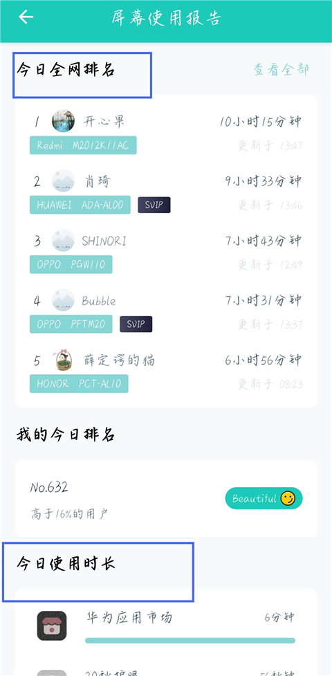5、用户在此查看自己的排名情况,以及手机各个应用的使用时间。