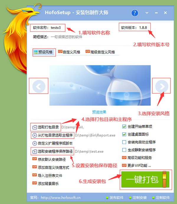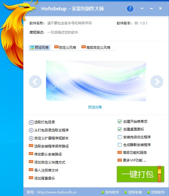 1、一键制作安装程序: 提供了简单易用的界面,只需填写简单的软件信息和进行简单的设置,就可以一键打包成精美的安装程序。 2、极速安装: 具有超快的安装速度,让用户不再等待漫长的安装过程。 3、炫酷效果: 支持添加多种炫酷效果,给用户带来抢眼的视觉冲击,使安装过程成为一种享受。 4、高级自定义风格: 提供了强大的自定义功能,支持背景图片替换、界面大小自定义、程序图标替换等,可以轻松创建具有专业外观的软件包。HofoSetup(安装包制作大师)新手教程