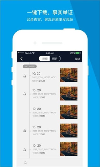 1、一键下载,事实举证 2、记录真实,客观还原事发现场 3、便捷回放,锁定关键时刻,在路上的精彩视频 4、防被盗,防剐蹭,实时监控,推送报警 5、远程唤醒,足不出户,全方位掌握爱车状况,行驶视频,无线预览 6、不耗流量,随手查看记录视频画面软件功能