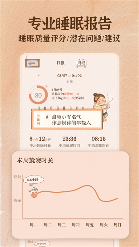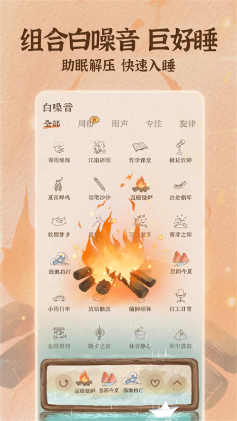 【自由搭配丰富白噪音 分分钟入眠】 优质白噪音支持多款搭配方式,风、篝火、雨、流水、鸟鸣、虫鸣声打造你的专属睡前氛围,让你逃离浮躁都市,更快入睡,改善睡眠质量。首页灵动可爱的触发式环境白噪音彩蛋,等你破解。 【鼾声梦话记录 专业睡眠质量报告】 监测你的睡眠周期,分析深睡浅睡占比,输出专业可视化睡眠分析报告,让您更好的了解自己的睡眠质量及健康状况,并提出相应睡眠改善建议和健康风险提示。 【世界公认快速入睡法 总有一款适合你】 3分钟入睡练习,让睡意自然发生。 美国海军两分钟入睡法、YogaNidra古印度入睡、Savanna催眠术、烦躁失眠练习、压力型失眠练习、腹式呼吸助眠... 【专属睡眠改善计划,告别失眠】 根据不同失眠原因,用心打造21天针对性睡眠计划。从失眠根源出发,结合美国医师学会认证的CBT-I,打造一套在家轻松执行的一线睡眠改善方案。 【坚持早睡 做时间的主人】 只需设定一个有挑战性的就寝、起床时间目标,每日达成你设置的目标,就可以在小院领养到可爱又治愈的流浪猫。 【沉浸时刻打造,提高专注】 “专注力已经成为了这个时代非常稀缺的心理资源”。 多个沉浸式环境营造,挑选属于自己的专注环境,提升专注力,高效学习、办公。更新日志