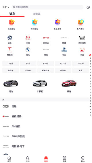 3、而在【选车】页面,我们还能看到非常详细的筛选功能,筛选内容包括汽车品牌、汽车价格、汽车规格等。