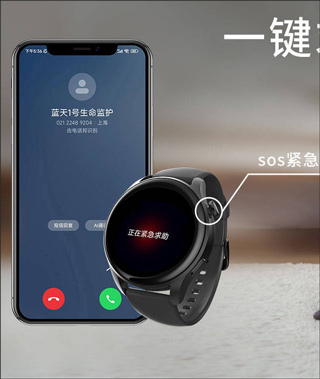 如遇紧急情况,长按手表右侧上按键,一键求助,系统即向紧急联系人拨打求助电话,防止意外升级。