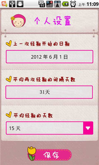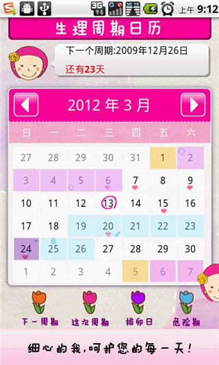 1、记录体重,助您瘦身 生理期与瘦身效果密切相关,可以记录每天的体重哟。 2、可以把握每天的身体状况 生理期前出现的焦虑情绪或者面部粉刺,都会让女生苦恼不已。会告知您身体的周期性状况,让您更加放心。准确计算出易瘦时段,助您实现完美瘦身。 3、在通知栏显示预定日 会及时通知您预定日,再也不用担心手足无措啦。可以自由编辑通知用语,被别人看到也不会尴尬哟。可以自由选择提前几天通知,非常便利。 4、安全的密码功能 保护不想被人知道的隐私!更新日志