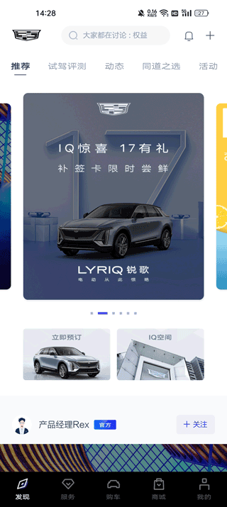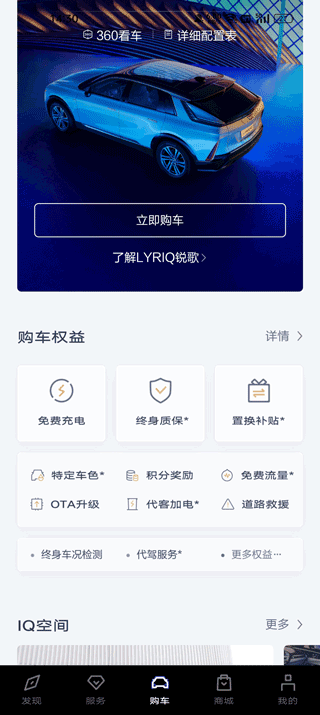 选配车辆 ,完成辆车预定/预订、预约试驾;限时大定,还可享限时定车权益;车主绑车后,可在此板块进行车控操作。