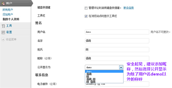 一、设置个人资料 建议大家完善一下自己的基本信息,因为有些WordPress主题是会调用到这里的信息的。 打开 用户 - 我的个人资料: 需要注意的是,建议填写一下昵称,然后设置【公开显示为】选择除了 登录的用户名 以外的其他名称,这里的内容会在网站的前台显示,如果你直接使用 登录的用户名,存在安全隐患。