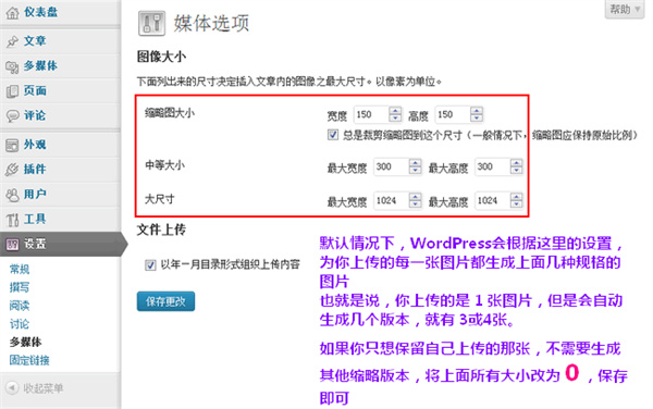 默认情况下,每一张上传的图片都会生成上面几种规格的图片(看图中文字介绍),如果不需要生成多种规格占用空间,可以全部设置为零,保存即可。