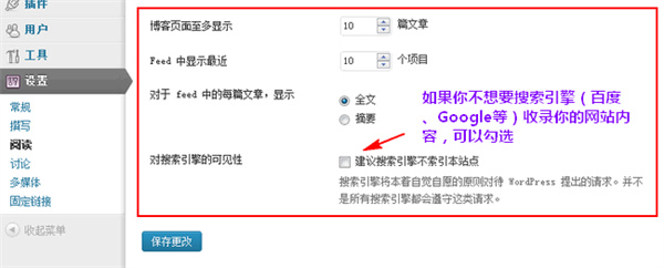 可以简单设置下页面显示文章的篇数(不同的主题设置可能不能),还可以设置是否让搜索引擎收录。