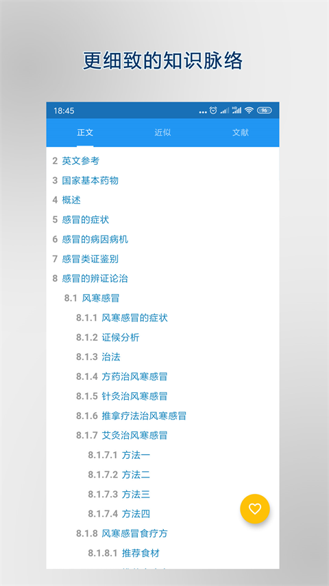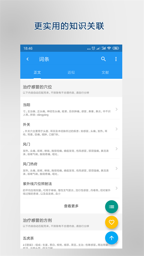1、浏览词条和新闻,查看相关词条及文献,浏览过的词条可以离线使用(自行设置缓存时间)。 2、搜索词条(词条名称搜索、全文搜索、限定类分类搜索)、搜索历史、热词推荐。 3、相关词条推荐(包括相关穴位、相关方剂、用到某药材的方剂、相关中成药、相关药物及无类目限定相关词条)。 4、词条热点推荐(日、周、月、年榜)。更新日志