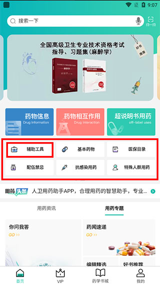 1、首先下载进入人卫用药助手,在首页找到辅助工具;