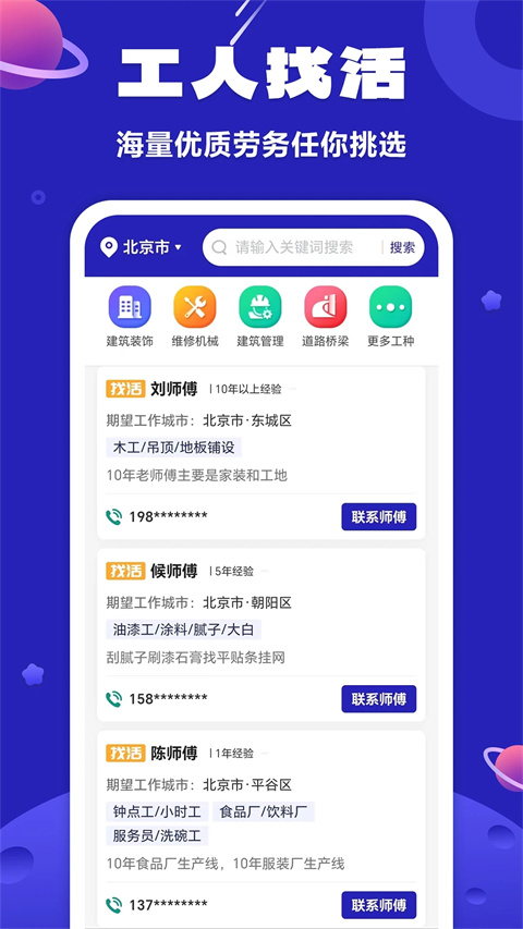 1、实名认证 实名认证有保障,不怕被骗; 2、工种齐全 精准职位分类,招工一步到位; 3、电话沟通 有问题随时沟通,方便快捷; 4、同城招工 手机发活找活,同城用人不再难。特色功能