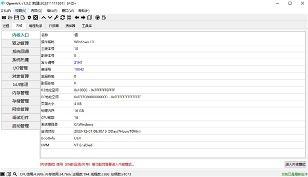 内核管理器:OpenArk 具备内核管理器功能,能够深度检测操作系统内核,发现潜在的恶意软件。 驱动程序分析:该工具可以分析驱动程序的动态链接库,识别异常驱动程序并进行处理。 内存/存储检测:OpenArk可以扫描系统内存和存储设备,查找异常数据和恶意软件。 进程杀死:这款工具支持进程杀死功能,能够快速定位并清除恶意进程。 线程模块注入:OpenArk 可以分析线程模块,发现并处理异常模块。 PE 文件解析:支持 PE 文件解析,便于分析文件结构和功能。
