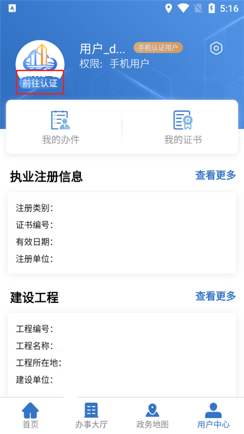 2、进入应用后,在我的页面中,点击前往认证;
