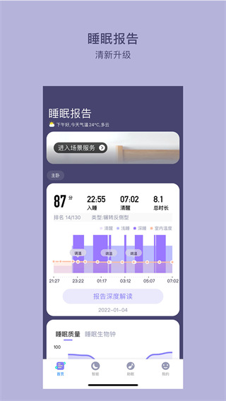 1、集实时监控、睡眠报告、改善日记、家居助眠等多个功能为一体的app。 2、它能将所有睡眠相关的数据进行跟踪记录并分析,自动生成睡眠报告,定期给出睡眠建议,从而为您提升睡眠质量。 3、不仅如此,智能场景还可以提供更便捷的互联可通服务,全卧室的设备都会根据您的睡眠状况进行调节,从而为您打造优质的睡眠环境,为您的健康睡眠保驾护航。更新日志