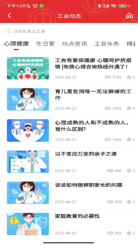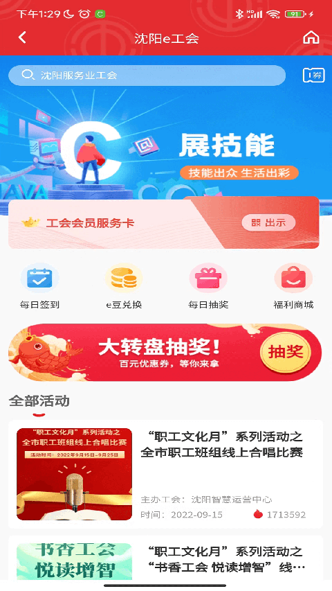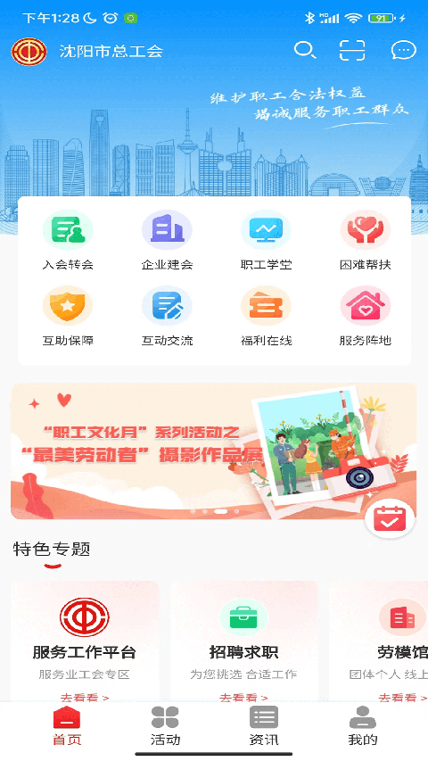1、便民服务 为职工会员提供公积金查询、话费缴纳、宽带固话缴费、社保缴费及自来水缴费等便民服务,使职工会员足不出户就可以办理日常生活业务。 2、活动专区 展示各级工会发布的精彩活动,职工会员可查看、搜索活动,在线报名参加感兴趣的活动。 3、工会地图 对全省工会各类阵地进行展示,包括各级工会办公地址、爱心驿站、母婴关爱室、文化宫等,职工会员可在线查看并定位详细地址。 4、婚恋交友 职工会员通过在该模块填写个人信息及择偶意向,打开交友渠道,通过信息筛选认识朋友,并可报名参加各类线下婚恋活动。 5、劳模工匠 对全省各级劳模、工匠、创新工作室进行展示,在职工会员中大力弘扬劳模精神、劳动精神、工匠精神。 6、服务大厅 为职工会员提供的所有线上服务进行整合,可直接通过该模块快速找到所需服务。 7、会员服务卡 所有认证通过的职工会员可以在app内生成一张会员服务卡(电子卡),通过会员服务卡可享受工会各种普惠活动。 8、沈阳工会消费扶贫商城 沈阳工会消费扶贫商城提供了包含沈阳茗品、时令鲜蔬、山野干货、休闲零食、禽畜肉蛋、米面粮油、新鲜水果、厨房调料等 8 大品类共计千余款产品,职工会员可以在商城选购,通过“以购代捐”“以买代帮”的方式助力消费扶贫。沈阳e工会app怎么用