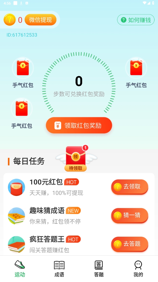1、精准计步与目标管理:能精准记录每日步数,还支持用户设定步数目标,通过记录和督促,助力用户养成规律运动的健康生活习惯 。 2、健康知识获取:设有健康问答板块,用户可每日积累健康小知识,还提供推荐文章,涵盖运动、健康等资讯,帮助用户提高健康意识,养成养生好习惯。 3、个性化健康服务:支持记录体重信息,依据用户步数和体重进行分析,给出个性化健康建议;饮用水打卡功能可帮助用户监控水分摄入量,提醒科学饮水。 4、丰富运动数据呈现:提供丰富运动数据分析,如消耗卡路里、跑步速度等,让用户全面了解自身运动情况。 5、社交与激励机制:用户可查看自己和好友的运动排名,激发运动动力;还能在社区交流经验、分享健身心得 。 6、趣味赚钱模式:步数积攒能在应用内换取红包奖励,首次登录送新人红包,连续登录有惊喜礼包;运动首页的成语答题也能让用户利用闲散时间赚钱。更新日志