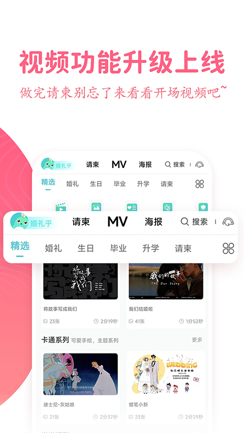 1、精美模板→第一眼就不一样 婚礼电子请柬、生日派对、宝宝满月、宝宝百日宴、同学会、毕业升学宴、谢师宴、生日宴、老人寿宴、乔迁、婚礼纪念等海量精美电子请帖模板。 2、多种风格→为挑剔而生 长页公众号风格、小红书超火崽崽风格、森系、轻奢、简约ins、花语、卡通、韩版、中式、快闪。 3、便捷分享→以光速向好友分享喜讯 支持微信、朋友圈分享,与亲朋好友分享喜悦。 4、自助编辑→3分钟快速制作 可视化编辑界面、支持文字修改、照片极速替换,删除添加排序页面,做你的专属请柬。常见问题