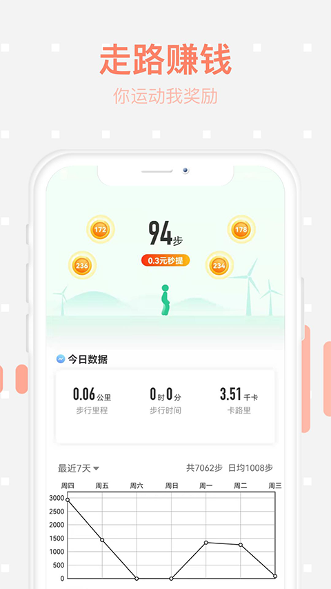 1、走路赚钱:每日走路3000步,收获健康和红包。 2、每日签到:连续签到7天,拆5元现金红包。 3、每日抽奖:幸运大抽奖,赚更多福利,上不封顶。 4、现金任务:轻松好玩的高收益现金任务,做的越多越富有。 5、邀请好友:邀请好友一起玩,直接奖励上千步数。软件优势