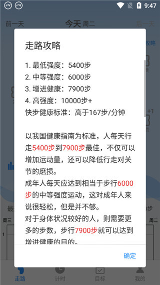 3、在走路攻略中我们可以了解关于运动的标准,了解自己的运动量。