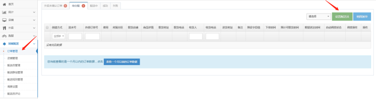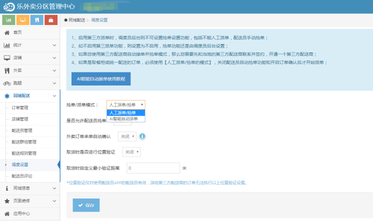 6、分区管理中心调度设置:开启配送员抢单,关闭则手动指派。订单是否需要确认后才能接单。设置取货距离。