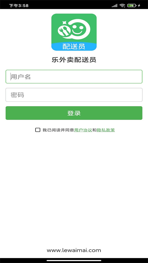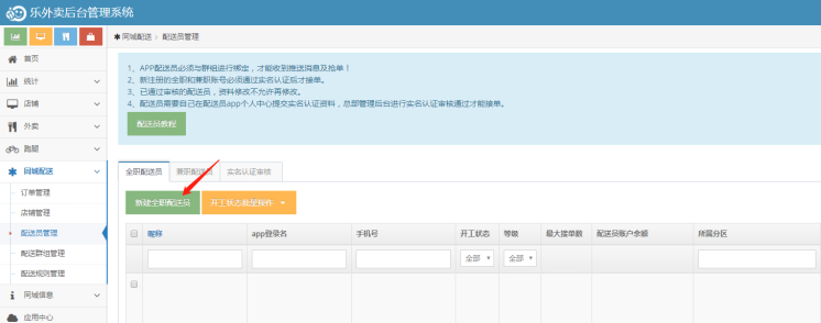 1、在乐外卖网页端后台的配送员管理中新建配送员,为每个配送员分配一个app用户名和密码,配送员可以使用这个用户名和密码登录乐外卖配送员APP(配送员的账号,密码都是平台自定义设置的)。