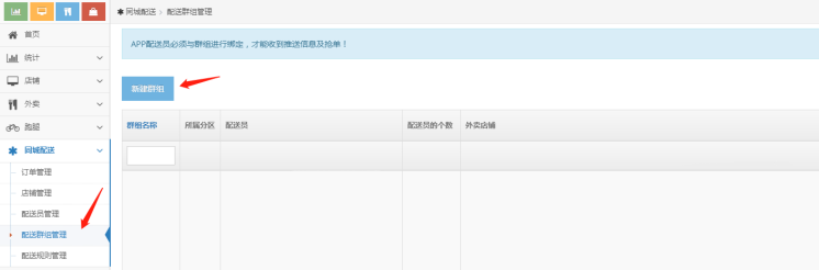 4、同时为配送员分配关联的店铺(可以是全部店铺或者某一个店铺),APP配送员必须与群组进行绑定,才能收到推送信息及抢单。