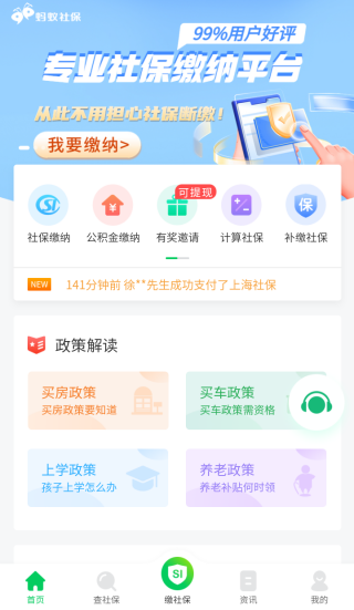 1、五险一金(包括养老保险、生育保险、医疗保险、工伤保险、失业保险、住房公积金)缴纳:足不出户,服务全程手机APP内完成,享受在家自助缴社保; 2、社保明细:快速计算出您应该缴纳的社保费用明细,以及退休后可用领取的养老金; 3、社保答疑:提供免费1对1专业在线社保服务答疑; 4、社保比价:支持不同城市社保缴纳费用比价; 5、增值服务:提供定点医院修改,社保调基等各类增值服务; 6、短信提醒:订单状态通过短信及时提醒,让缴社保更安心。蚂蚁社保app服务范围