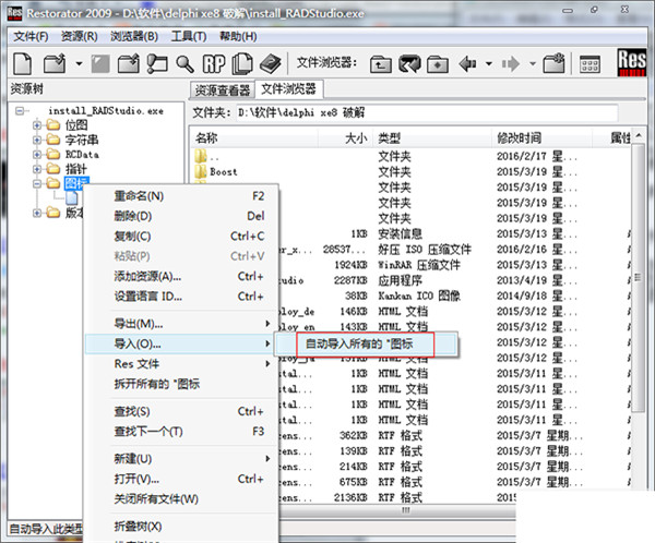 5.然后,点击左边资源树的“图标”右键导入所有图标,就会自动将你前面准备更改的图标导入进来,完成后点击F12进行保存。