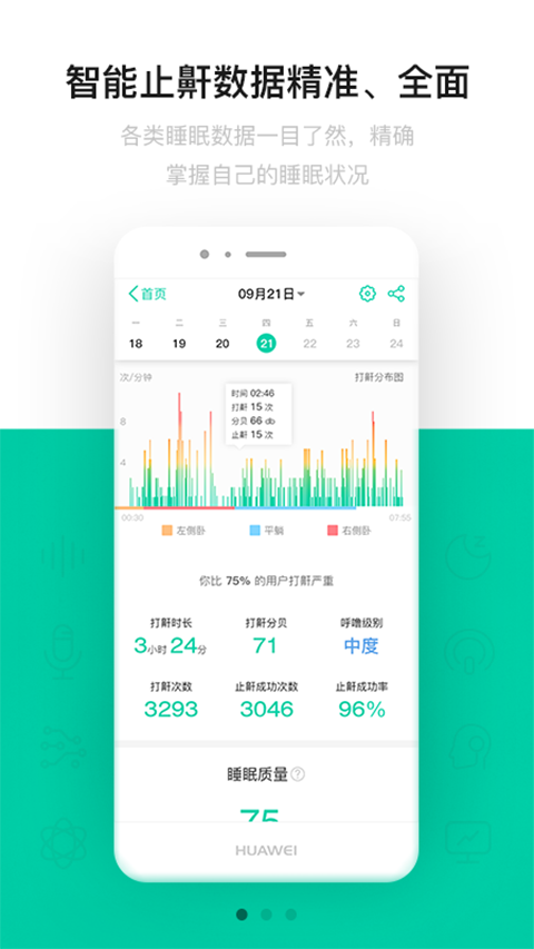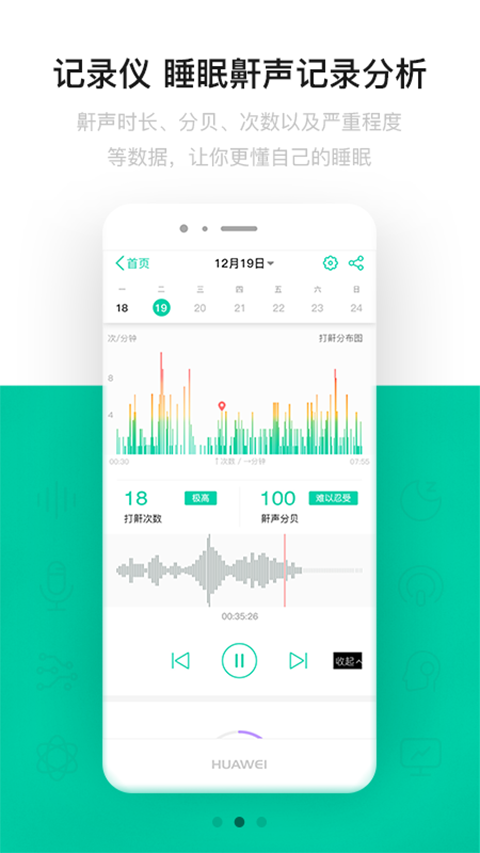 1、纯软件功能,无需借助硬件,提供睡眠质量监测,记录和分析你的睡眠 2、先进的鼾声检测算法,并记录鼾声音频样本,可随时回放了解打鼾情况 3、鼾声时长、分贝、次数以及严重程度等数据,让你更懂自己的睡眠功能介绍