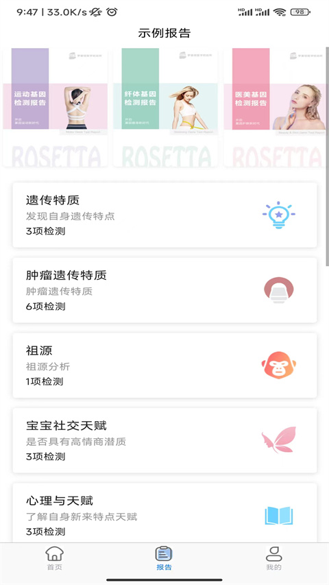1、报告查看,快速查看最新的报告,知道自己检测的详细数据和内容,方便查询全部数据。 2、唾液检测,通过用户的唾液就可以轻松检测出具体的数据,检测很科学,结果可靠。 3、快速寄送,把自己的唾液盒寄送到机构地址,在线输入个人信息就可以轻松查询。 4、应用分享,一键把应用分享给自己的好友,让对方也可以快速地检测出自己体内的基因。更新日志