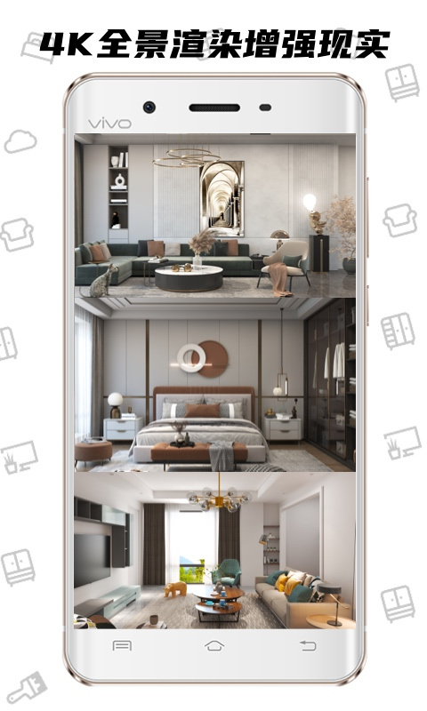 1、装修效果图 app内支持极速三维摆放,快速高清渲染,真实房型尺寸,一键渲染效果图和全景图,鸟瞰图,漫游图。 2、全国百万户型库 开放全国百万户型库资源,搜索小区户型,立即装修设计。 3、模拟现实 临摹户型图,快速生成三维模拟空间,通过海量素材库,可快速将客户的家、办公室还原在眼前,增加舒适度和信赖感。 4、量房出图一体化 软件连接蓝牙测距仪,迅速精准出户型图,快速还原三维空间。 5、家具模型 100万模型任你收藏,设计更尽兴!App内支持人工智能,一键拖入整个房间的模型,自动智能摆放,高速出图! 6、设计指导 免费视频教程,快速自学室内设计出图技能,专业客服全天指导。喜云app亮点