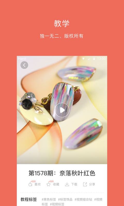 1、【视频教学】从基础教学到最流行日韩爆款设计,高清教学视频每日更新,精彩不停; 2、【求教程】等你来挑战,你琢磨不透的款式PO上来,只要人气够高,大咖为你定制专属解密教学视频; 3、【大咖圈】这里有高颜值讲师、不吐槽不死星人、怪蜀黍、90后小鲜肉、各种精彩,各种八卦; 4、【咖币】边玩边挣咖币,想怎么花就怎么花,有钱任性; 5、【个人主页】专属个人的美甲专区,出作品、攒人气、圈粉丝。软件特色