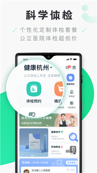 1、【科学体检】全国2000+公立医院极速预约体检,个性化定制健康体检,APP免费智能报告解读,早发现,早改善。2、【健康管理】一键建档,生成专业健康状况评级,大数据对比同地区\\同龄人群健康水平,直观感知自身健康水平。